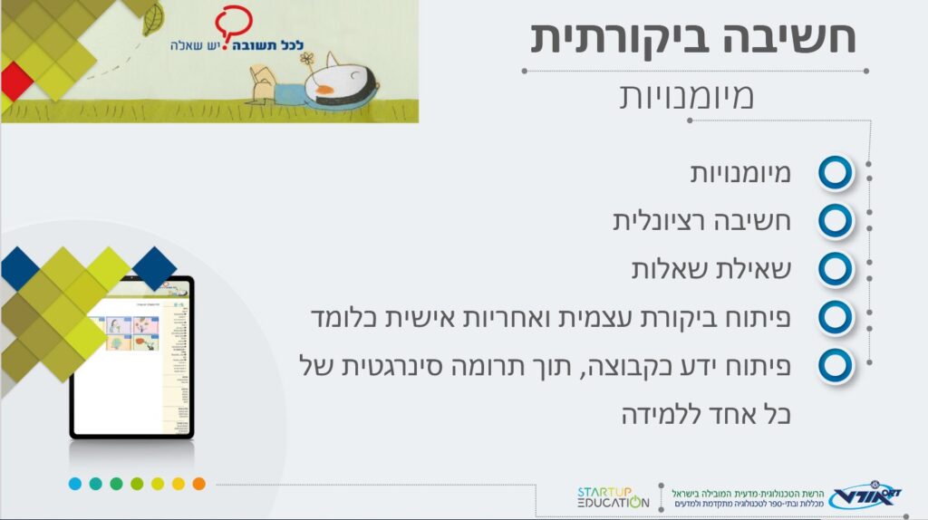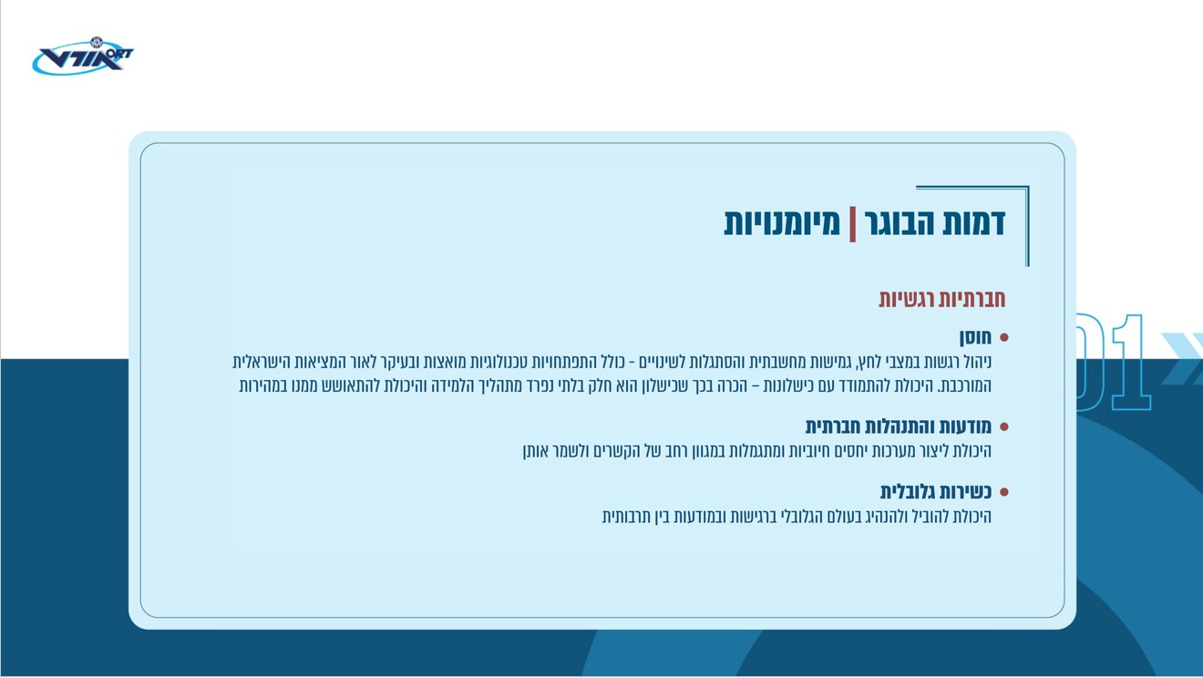 חזון רשת אורט ישראל מתייחס לבוגרים בעלי מיומנויות קוגניטיביות, חברתיות ורגשיות. חשיבה ביקורתית; חשיבה יצירתית ויזמית; אוריינות דיגיטלית וכשירות מידע הם חשובים באותה מידה כמו חוסן; גמישות; מודעות והתנהלות חברתית וכשירות גלובלית. מהפכת הבינה המלאכותית הביאה עימה צורך מיידי בבחינת המיומניות הנדרשות לעולם התעסוקה והיא מציבה אתגר באופן בו מחברים את התלמידים לתנאים בעולם משתנה. לא רק זאת, כניסת הבינה המלאכותית למרחב החינוכי השפיעה גם על מיומנויות הלמידה וההוראה המחייבים גמישות וחשיבה ביקורתית.